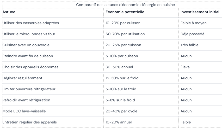 Pour choisir parmi ces astuces d’économie d’énergie en cuisine, considérez d’abord votre situation personnelle et vos équipements. Les gestes quotidiens comme cuisiner avec un couvercle ou éteindre avant la fin de cuisson sont adaptés à tous et ne coûtent rien. L’entretien régulier et l’optimisation des appareils existants conviennent aux personnes soucieuses de préserver leurs équipements. Pour les foyers prêts à investir, le remplacement d’appareils anciens par des modèles avec une bonne étiquette énergétique représente un coût initial important mais offre les économies les plus significatives à long terme.